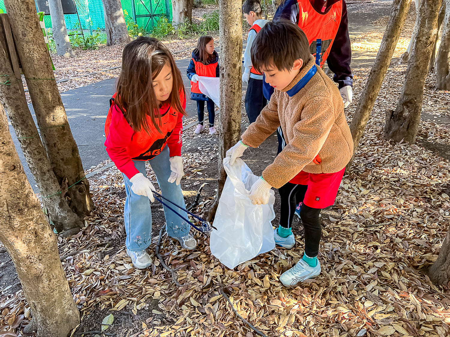 保護者に見守られながら、公園内の落ち葉や茂みの中に隠れたごみや放置された携帯電話などを回収し、身近な環境への影響を体感しました。 清掃活動を通して、地域住民と空間を共有する意識や「共に生きる」姿勢を学びました。
